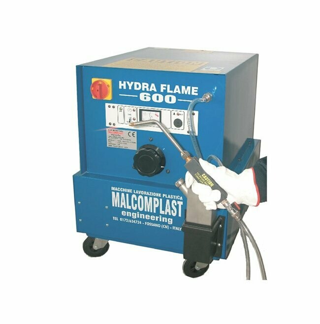 Hydra Flame es un generador de gas alimentado con agua destilada y corriente eléctrica. Gracias a la acción electrolítica escinde los elementos que componen el agua: el hidrógeno y el oxígeno, y los mezcla en proporción combustible. Produce una llama de forma puntiaguda de mínima oxidación, que alcanza una temperatura de 2700-3300°C. La máquina Hydra Flame se halla especialmente indicada para pulimentar los bordes, para las superficies curvas o esféricas, para orificios, etc. de metacrilato (plexiglass), pero puede ser utilizada también para fundir, soldar en óptica, en bisutería, etc. La máquina Hydra Flame es muy sencilla y segura de usar, y permite realizar trabajos con el mayor grado de seguridad posible sin necesidad de personal especializado.